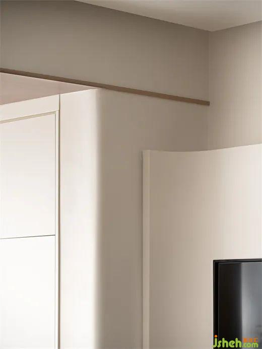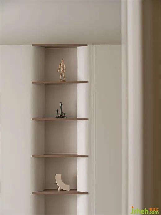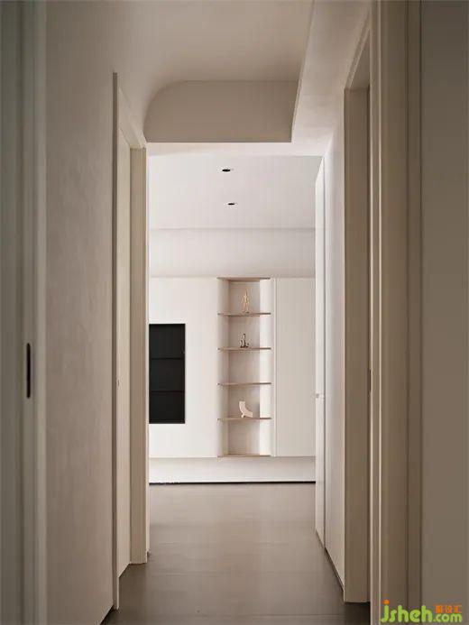 走廊圓弧造型與燈帶的設計,不壓低層高的同時滿足了照明、造型,提升了空間的延伸感;而客廳電視背景墻的置物架也為走廊增添了美感。