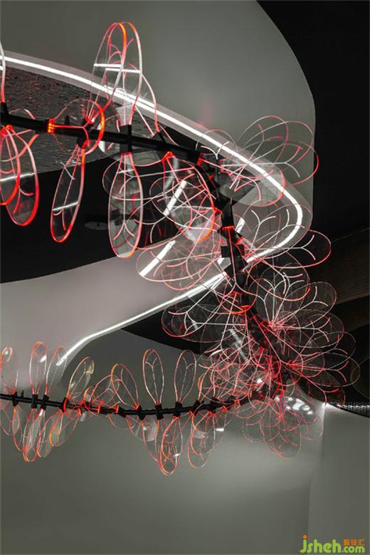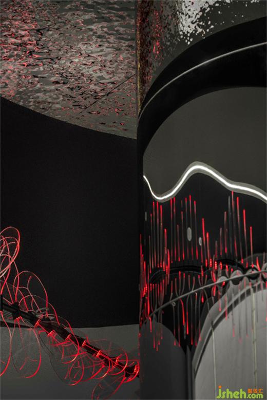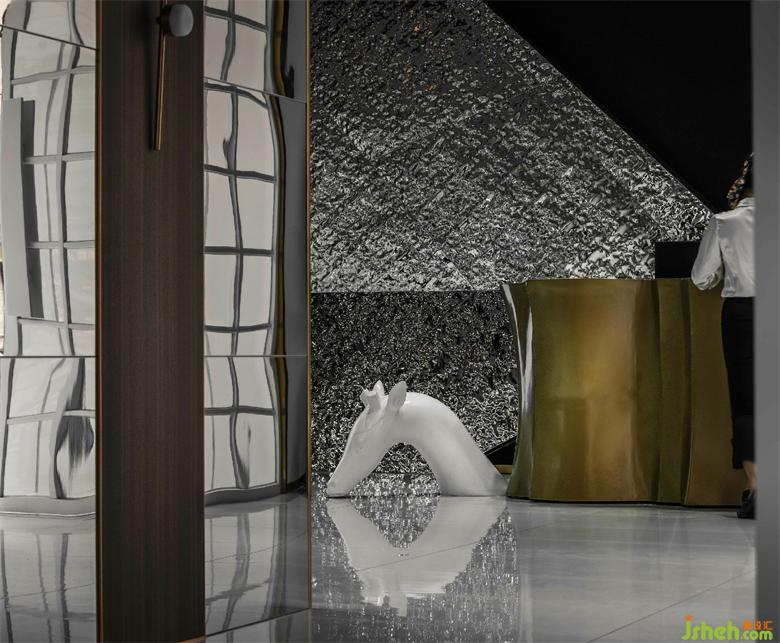 主要材料:鏡面不銹鋼、水波紋板、白色鏡面瓷磚、黑色背漆玻璃、定制烤漆雕塑