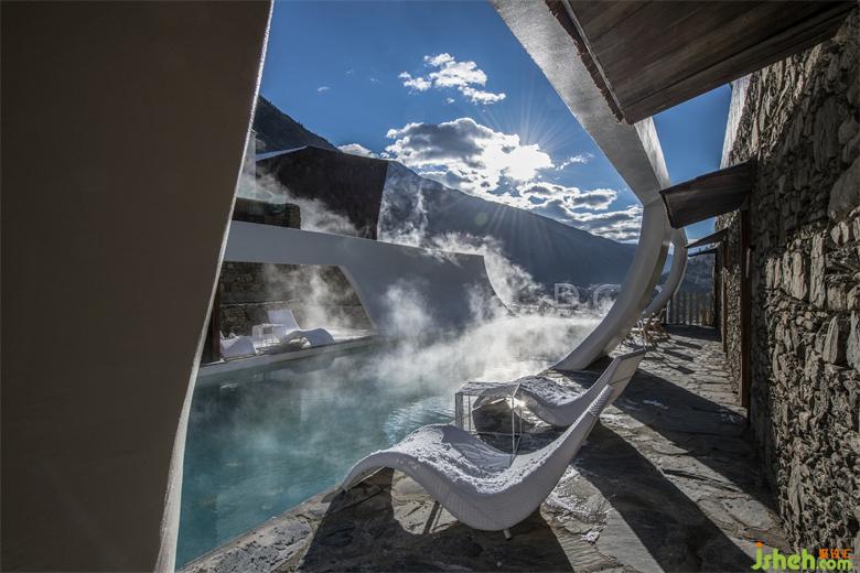 接待休閑區(qū)和住宿區(qū)之間是戶外泳池,引入了溫泉水。神山周邊有著豐富的地?zé)豳Y源,因此溫泉的水溫適宜、蒸氣裊裊。