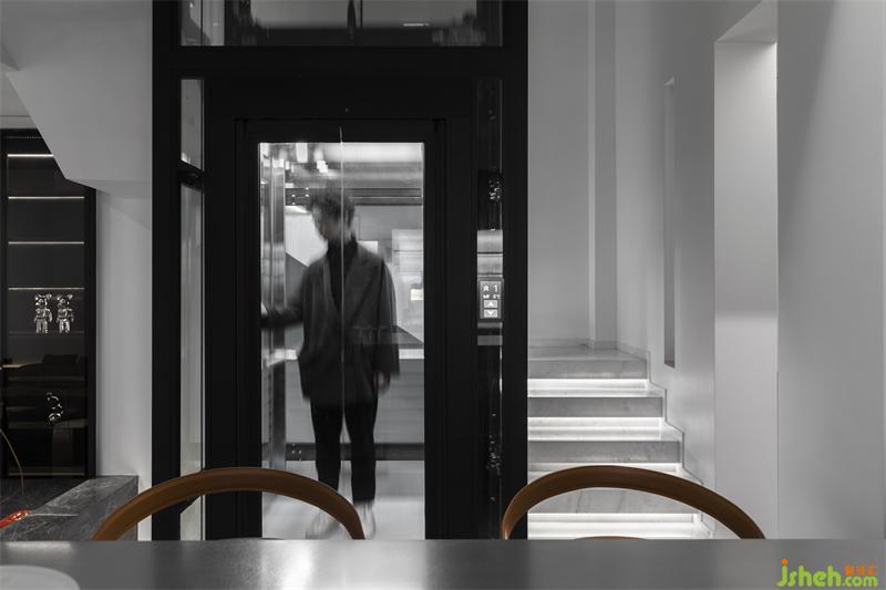 別墅設(shè)計公共區(qū)域的電梯井道加裝全透明電梯。滿足各個年齡使用。讓原有陰暗的空間變得敞亮寬敞。順延到地下室的采光部分。