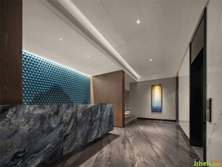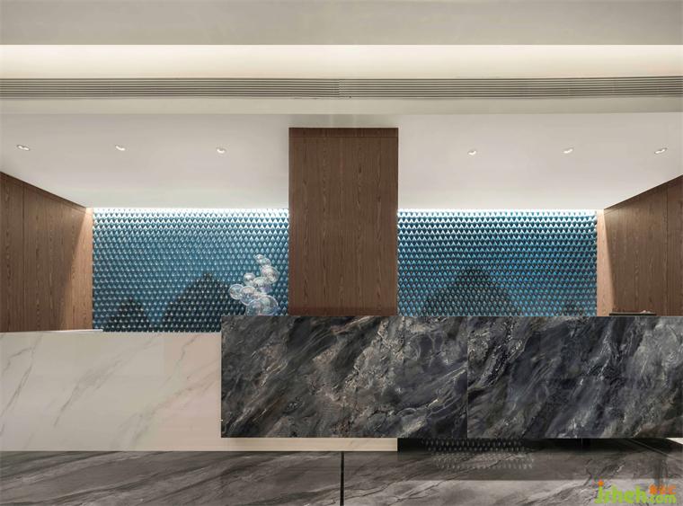 踏足大堂,酒店設(shè)計(jì)大堂空間的視覺亮點(diǎn)——碧藍(lán)色陶瓷墻畫是嶺南天地脈絡(luò)的抽象寫意,運(yùn)用藝術(shù)的手法,自然山水宛然若畫,光影交相輝映中,不著痕跡地開啟人文體驗(yàn)。