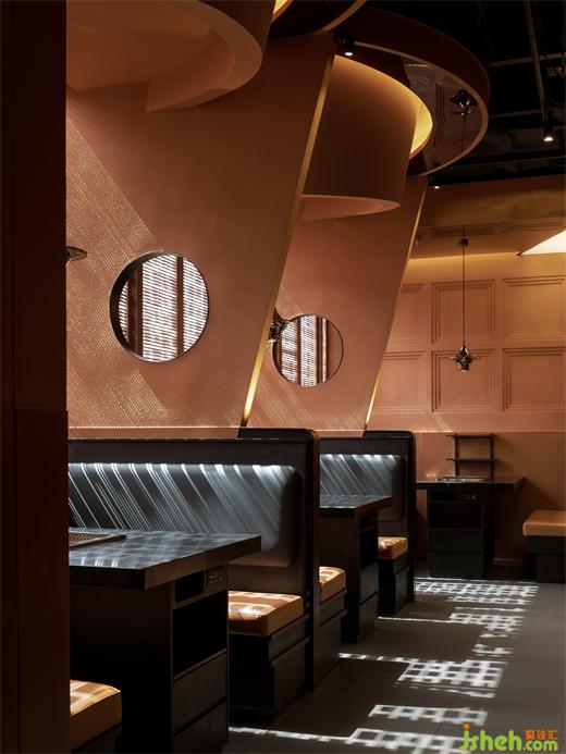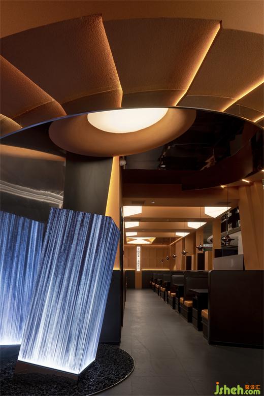 電影男主在潛意識中建造了一座烏托邦式的“光輝城市”。隨著夢的指引,空間進入到一個新的烏托邦城市。對稱折疊的階梯造型,結(jié)構(gòu)切割的力量延伸,節(jié)奏陣列的建筑輪廓,鏡面層疊的燈光閃爍,壽喜燒餐廳設(shè)計最終形成城市面貌的感受力。無盡衍生的城市體積展現(xiàn)著科幻片中烏托邦般建筑層層拔地而起的雄渾力量。