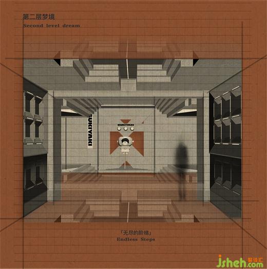 裝置打卡點的設(shè)計借鑒了盜夢空間的悖論建筑,壽喜燒餐廳設(shè)計了莫比烏斯環(huán)式的樓梯。利用有限的色彩,富有層次的肌理,以及層層洗光的氛圍,打造出未來主義的視覺風(fēng)格,配合獨特的故事主線,達到了感官、心理與設(shè)計故事上的平衡,一個無限夢境的循環(huán)虛擬,夢幻與現(xiàn)實中的往來同存。代表著盜夢空間的夢境第二層——無盡的天梯。