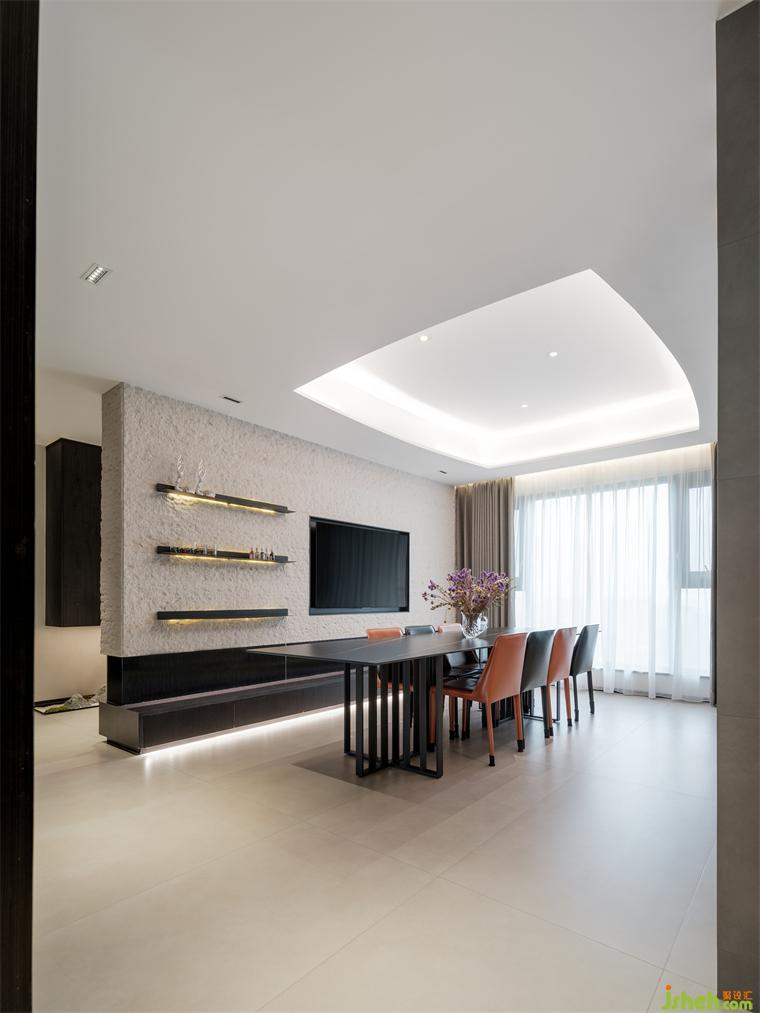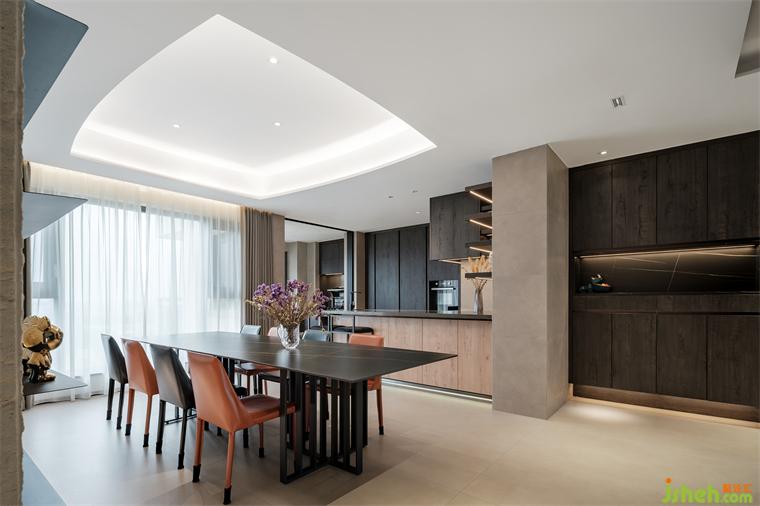 餐廚區(qū)維持色調(diào)統(tǒng)一時(shí)也讓暗色增多,色調(diào)下沉營(yíng)造靜享美食的氛圍。餐區(qū)的荔枝面天然大理石與弧形天花,同客廳細(xì)節(jié)遙相呼應(yīng),橙黑餐椅平添幾分視覺(jué)的小驚喜。