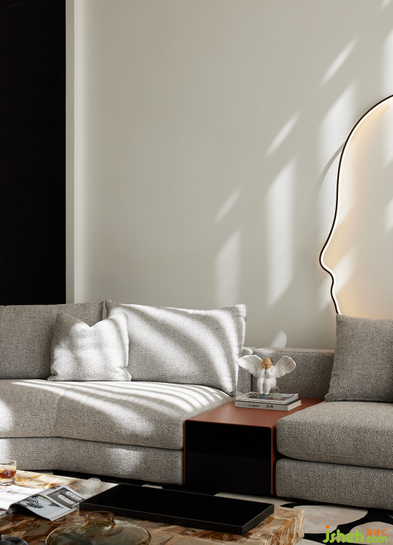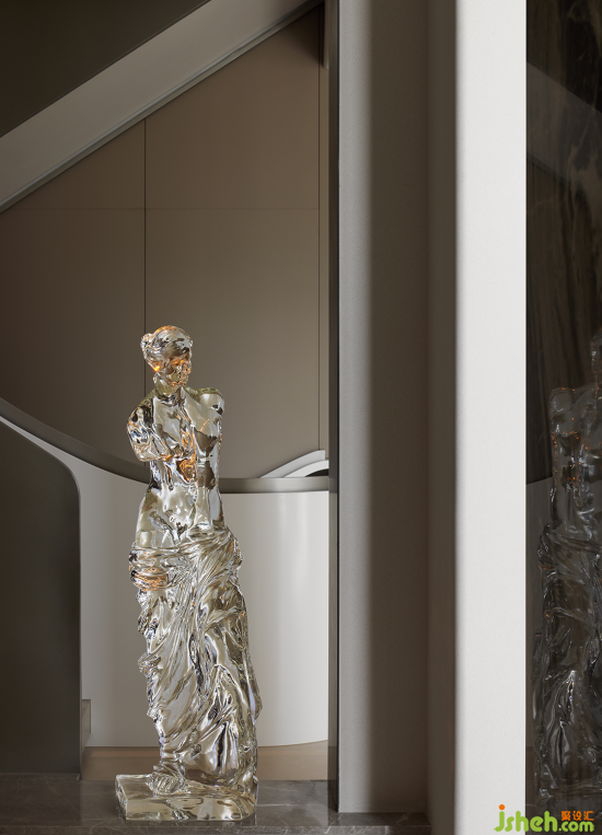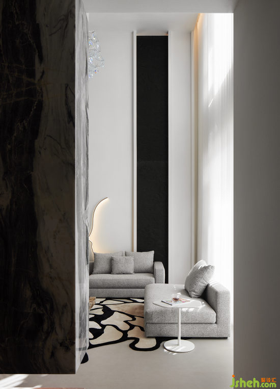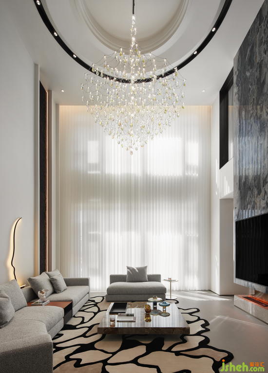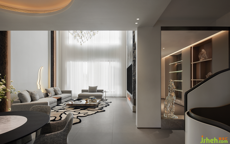 入戶歸家的氛圍充盈著白與灰低飽和但高級(jí)的色調(diào),結(jié)合簡(jiǎn)潔的構(gòu)建線條,渲染出奢雅純粹的美學(xué)領(lǐng)域。晶瑩剔透的水晶吊燈聚焦空間,層疊映射的光圈平添了一抹詩意的驚喜。