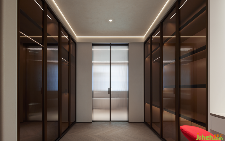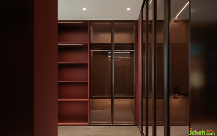 客臥之一以棕褐色調打造自然溫和的整體氛圍,褐色與紅色點綴在深邃的空間中更顯奢華,巧妙尋得完美的平衡。玻璃門衣柜簡約而不失高雅格調,彰顯出大氣利落的質感,秩序之中連接一日起居。