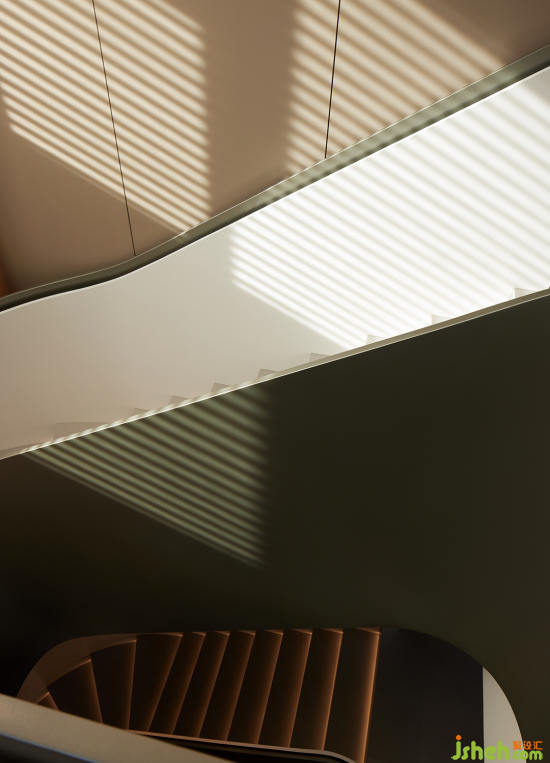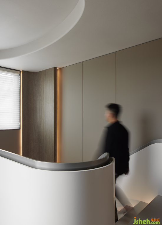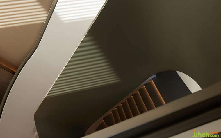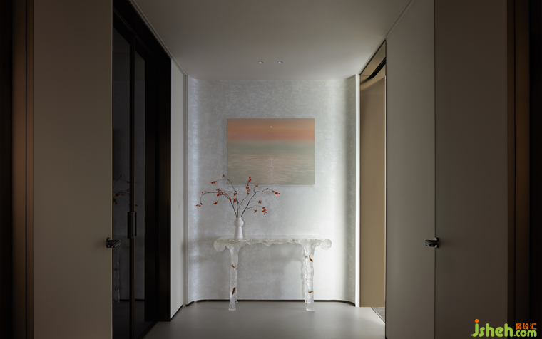 邁向位于三層的主臥,空間的層次感隨著步伐的推進而愈發(fā)鮮明。瓷質花瓶、玻璃桌臺與海上落日的油畫三者融合出藝術覺知,以簡而雅的線條構造出返璞歸真的精神境界。落日余暉折射相臨,滿目皆是溫柔暖意。