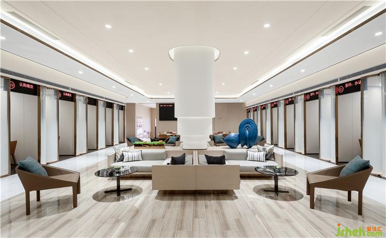 高級米灰咖色系結(jié)合白色天花、地面打造了一個(gè)舒適的互動(dòng)空間,張弛相間,變而有度??べ|(zhì)單椅與大理石桌面搭配,成熟友好,使空間富有層次和質(zhì)感。藍(lán)色藝術(shù)裝置及綠植的點(diǎn)綴,為空間添抹一筆明媚神采,生氣悠長。