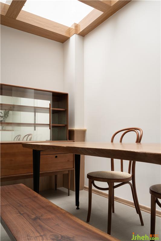 木制餐桌與頂面的木條裝飾相呼應(yīng),陽光透過木條與木條之間的距離照射在餐廳里,享受美食的同時也享受著大自然帶來的溫暖。