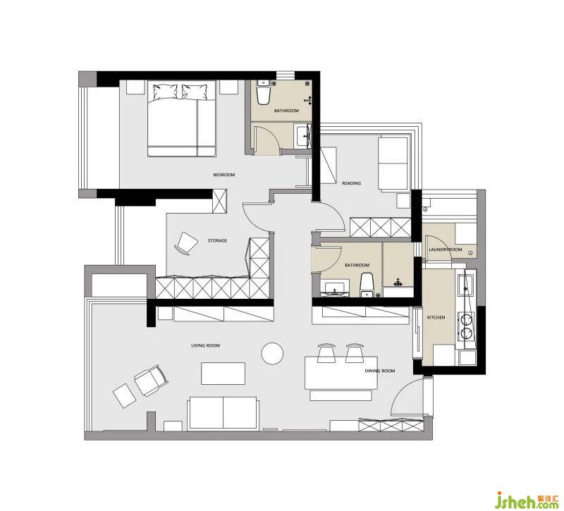 當(dāng)陽光從百葉中傾灑時,空間的光影與物件相得益彰。