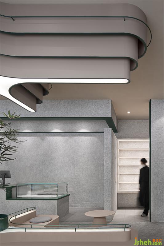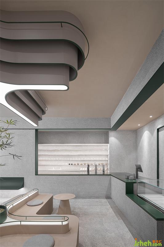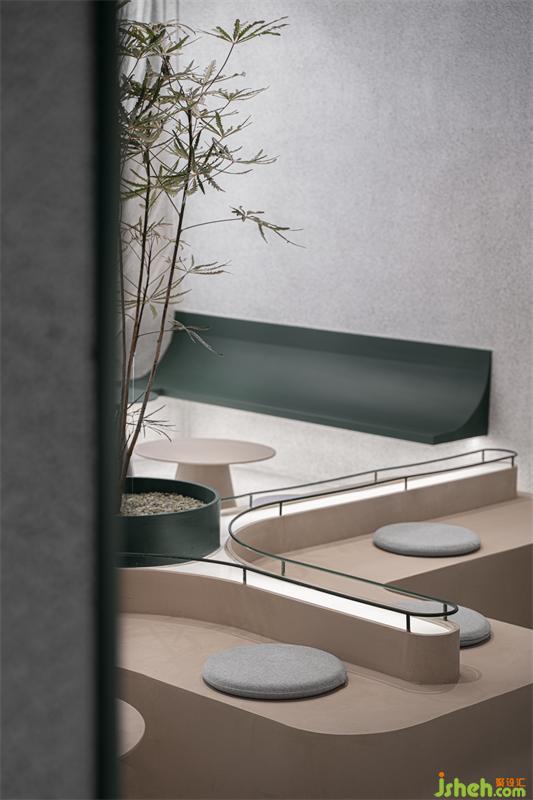 整體空間區(qū)域劃分不同,門(mén)口綠植和log的融合凸顯標(biāo)志性自然與健康的理念,門(mén)左邊玻璃的運(yùn)用使室內(nèi)通透性更強(qiáng),展示傳播產(chǎn)品制作過(guò)程,吸引路人。進(jìn)門(mén)右邊拍照打卡區(qū)不影響客人品茶聊天,左邊產(chǎn)品出品區(qū)客人隨時(shí)可觀(guān)看產(chǎn)品出品流程,也可品茶看窗外風(fēng)景