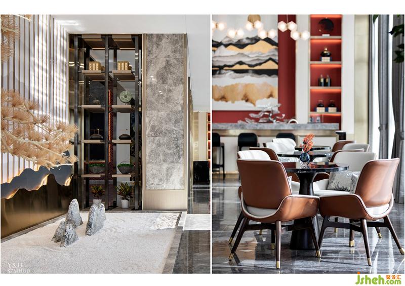 水吧區(qū)選用雅致的咖色皮革,讓空間暖而溫馨,墻面上的山水裝飾畫和吧臺上的藝術(shù)吊燈的曲線造型相映成趣, “山”“水”連綿渲染氛圍。