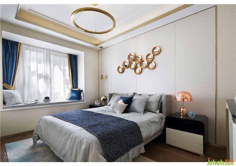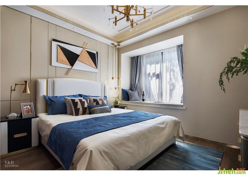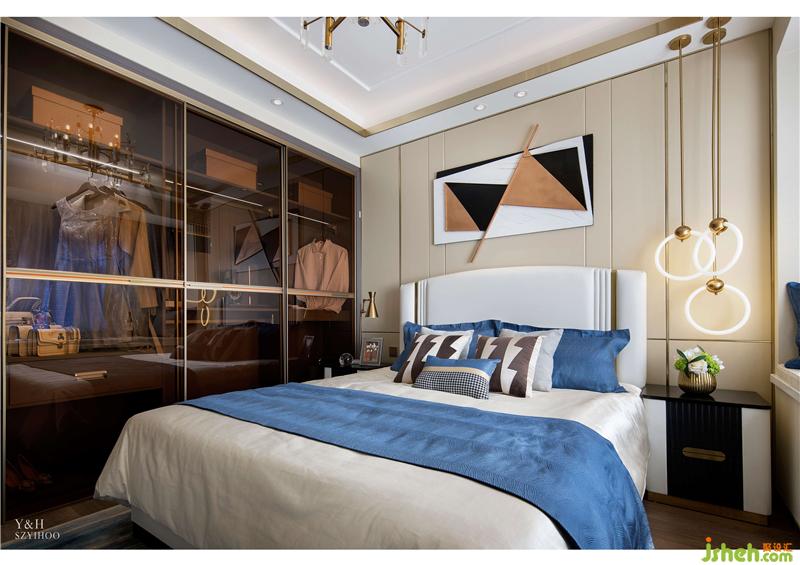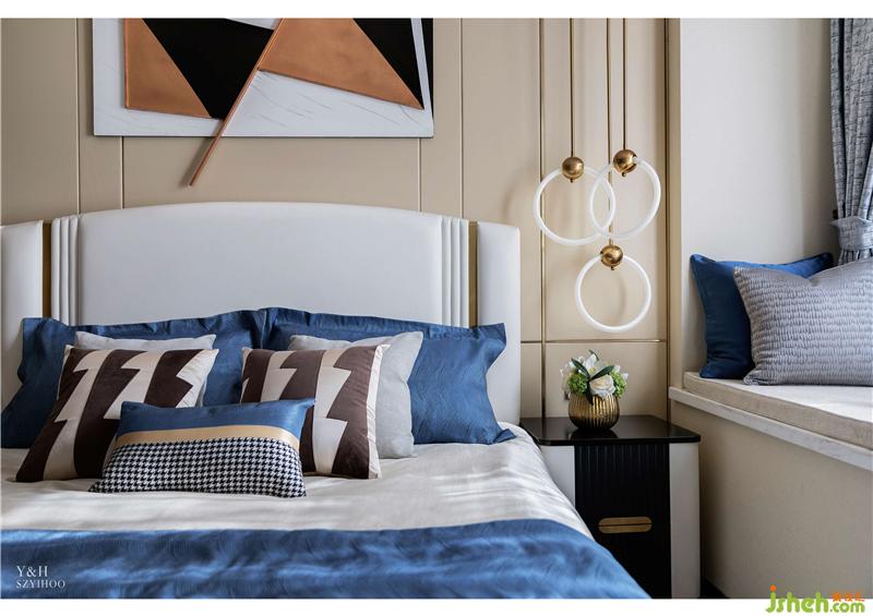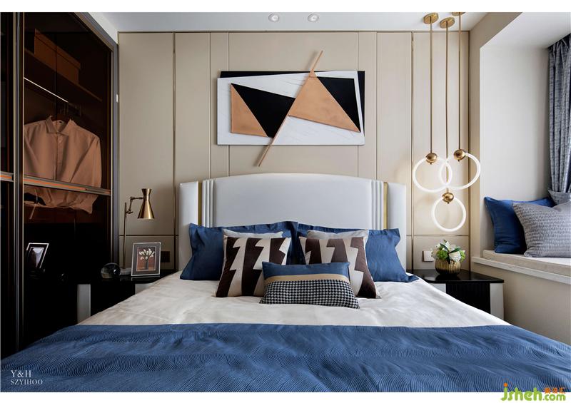 主臥摒棄繁復(fù)冗雜的擺設(shè),用簡潔明了的語言勾勒出生活的質(zhì)感,富有創(chuàng)造力的幾何掛畫增添空間的藝術(shù)內(nèi)涵。抱枕與地毯深淺不一的藍色,避免了色調(diào)的單一,使主臥空間層次感加強。
