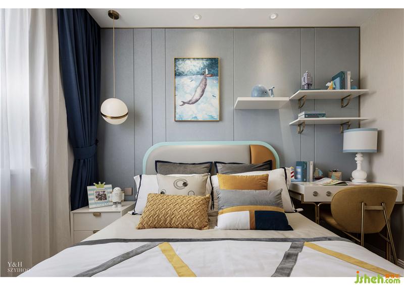 兒童房為孩子置辦了書桌,書桌上方鯨魚與機器人的擺件使兒童房別有風(fēng)趣。黃色與藍色的窗簾帶來了視覺上的沖擊,為整個空間營造了活潑的氛圍。