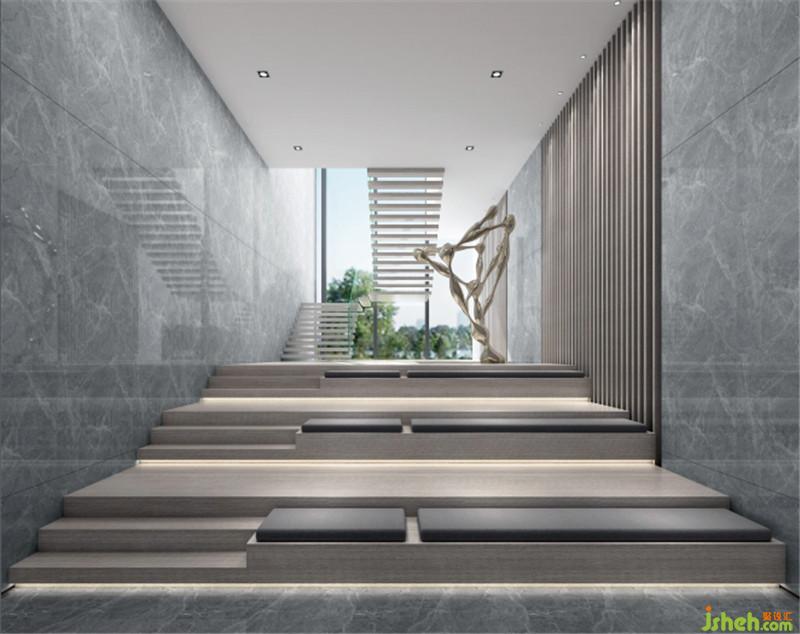在整個售樓處的中心位置,設計師設置了一個別致的空間:它既是兩層樓面之間的聯(lián)結(jié),又是多功能、可獨立的區(qū)域,這里是一個非傳統(tǒng)的“樓梯間”。寬闊的臺階具有落座的功能,搭配書架形成一個開放式的閱讀區(qū),同時設置于此的電子屏幕,可適時變身為一個圍攏式的空間,提供交流與學習的需求。臺階的層次交錯,進一步凸顯了整體空間的節(jié)奏感,也呼應了整體的線性意境。室內(nèi)設計師