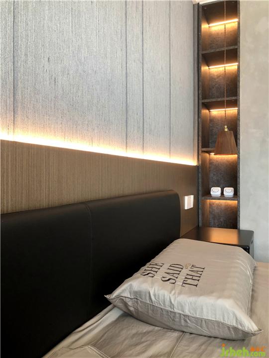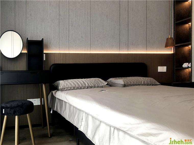 推拉門形成一個面,延長推拉門暗藏軌道做成燈帶形成線,線與面的結(jié)合,面于線上移動,同時在電視背景墻頂上設(shè)計一條平行燈帶形成兩條相互平行的長線,深圳家居設(shè)計既解決了照明問題,增加了空間的氛圍感,也讓整個空間多了一分張力。