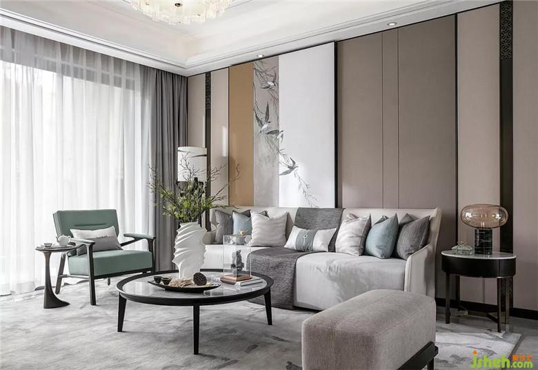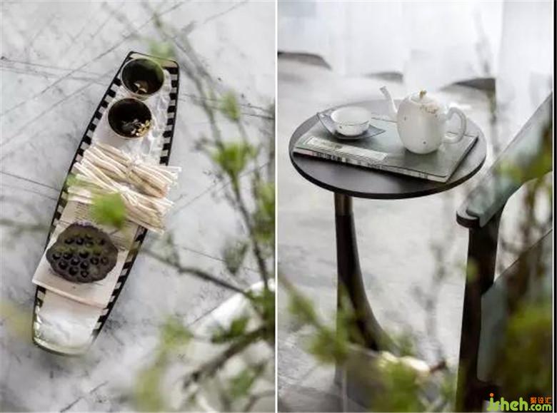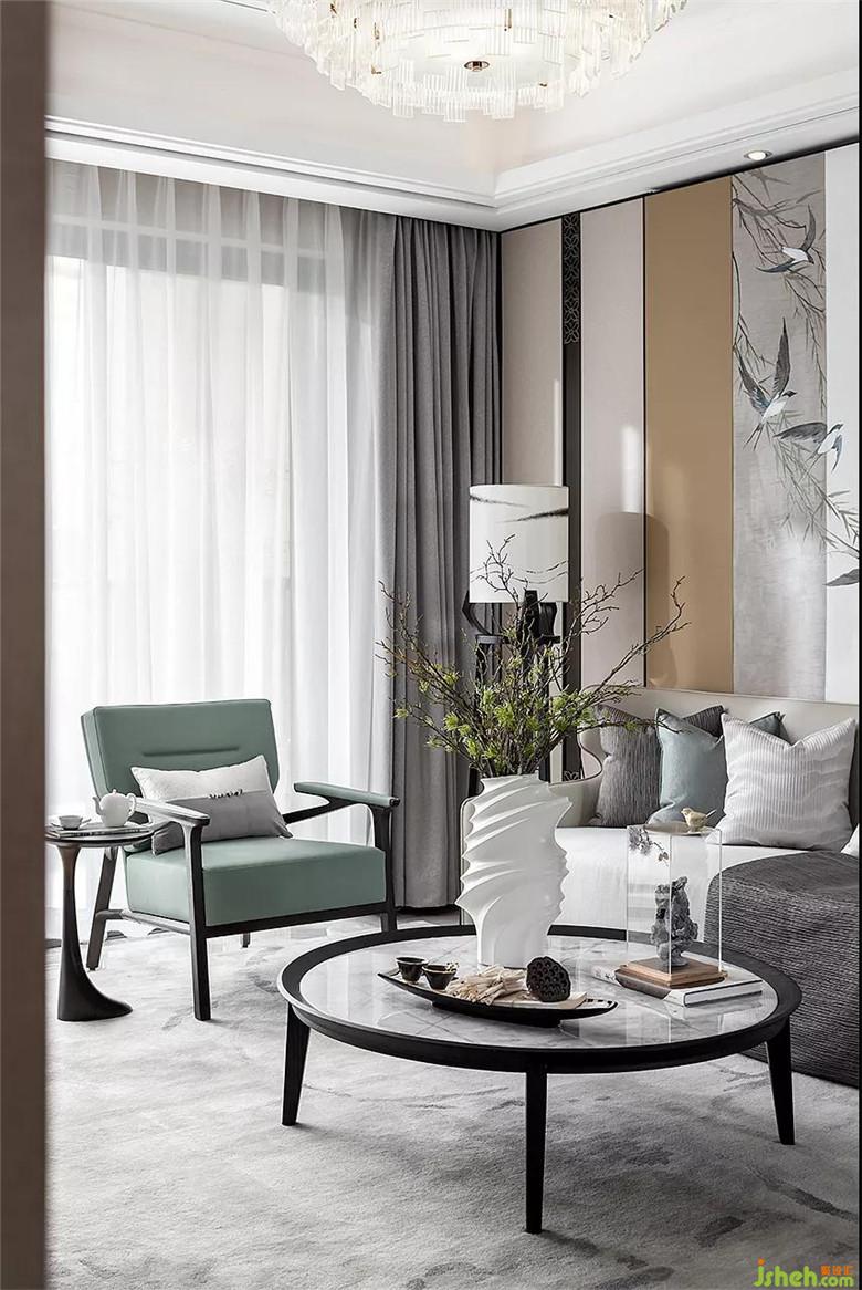 品綠色蔓延開去,一份韻味彌漫在空間。翠鳥翩翩,把勃勃生機(jī)帶入室內(nèi),茶幾帶泛泛水光,載舟而行與夏荷交映。漁歌唱完,碧水鳴天,天地被納于客廳一隅。