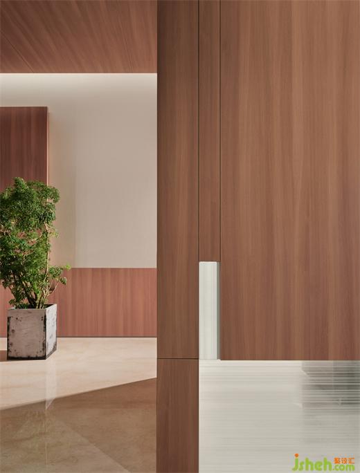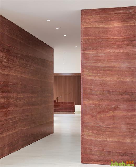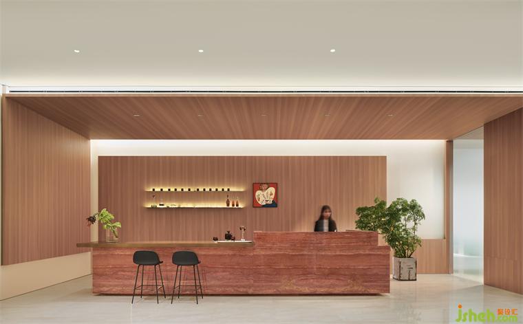 從門(mén)頭開(kāi)始,用通體的紅洞石搭建感官支點(diǎn),在造型上作內(nèi)倒、折疊處理,制造視線(xiàn)與動(dòng)線(xiàn)的轉(zhuǎn)折,長(zhǎng)道盡頭窺見(jiàn)前臺(tái)的“半身”,欲言而止且露高級(jí)。