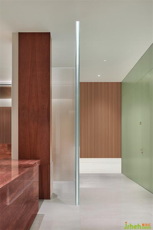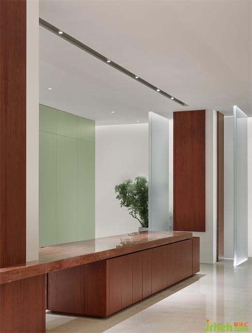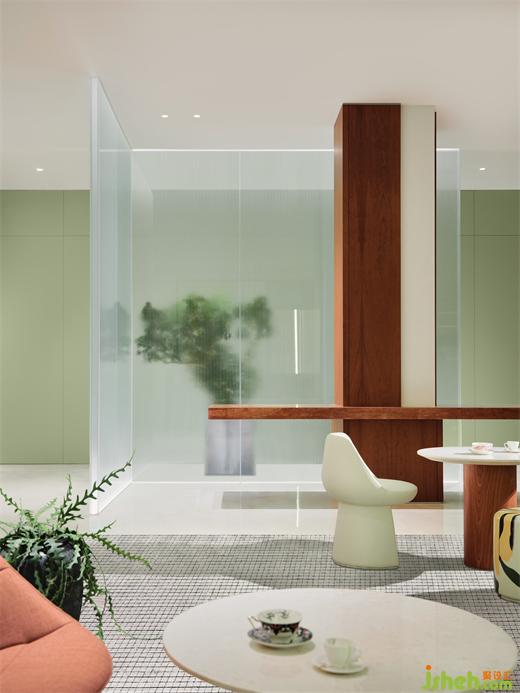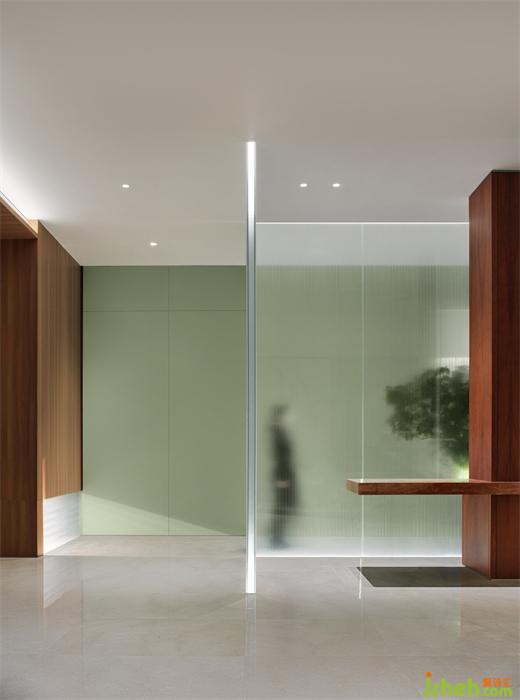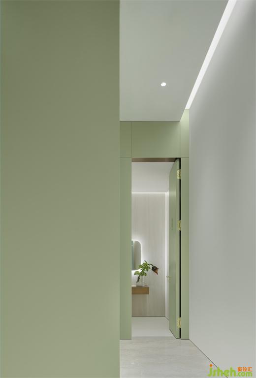 起伏流動(dòng)的公區(qū),與之相對(duì)的是一整片綿延的薄荷綠墻,輕薄地劃出開(kāi)放與私密邊界,門室隱入墻面,愈喚起向內(nèi)探索的興趣。
