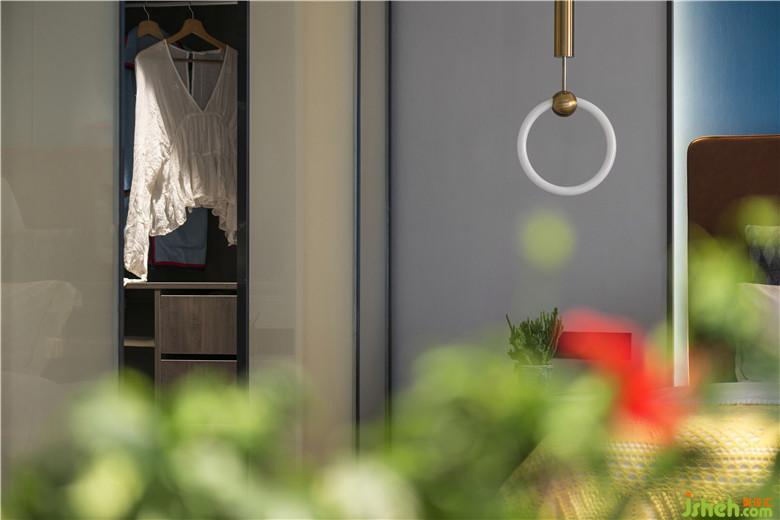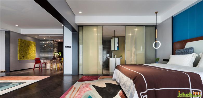 主臥床頭背景室內(nèi)設(shè)計(jì)師采用深藍(lán)色有助睡眠與休息,胡桃木色系的地板搭配讓空間更有質(zhì)感與穩(wěn)重