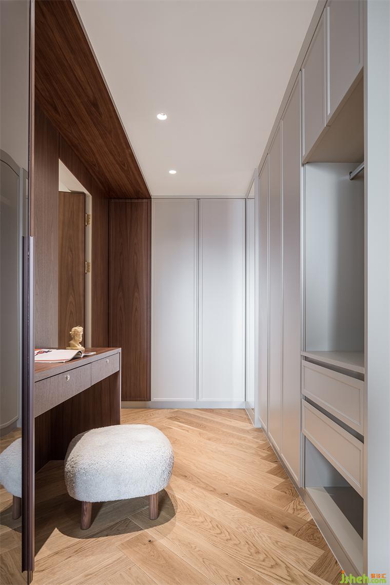 主臥衣帽間圍繞門和梳妝臺做了一體化木質框景設計,柜體,滿足了強收納需求,整體規(guī)整統(tǒng)一,收納空間足。