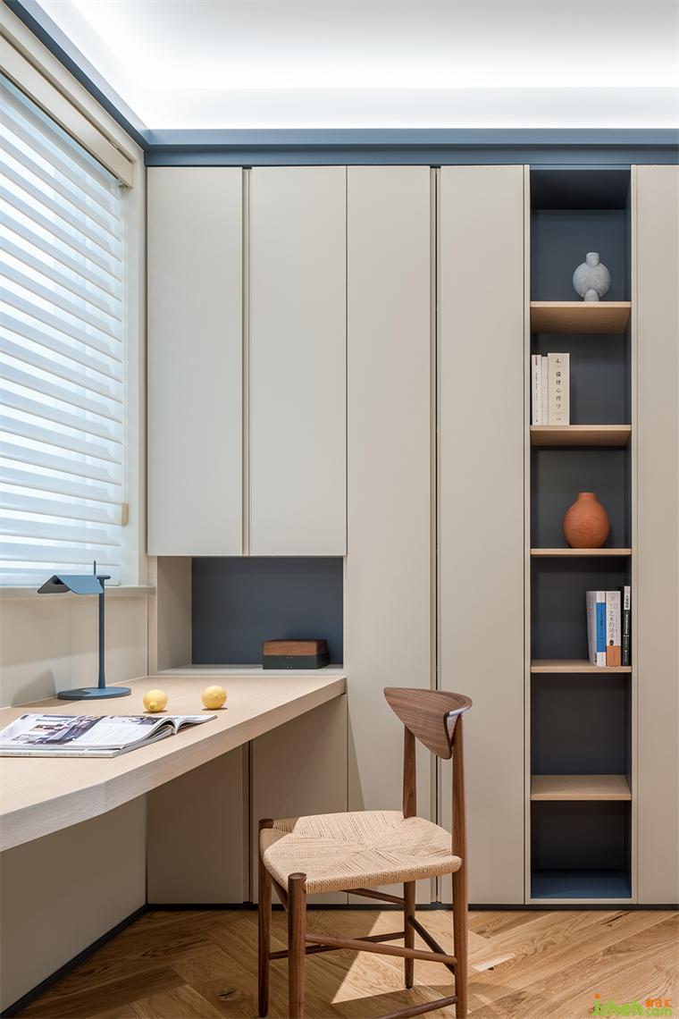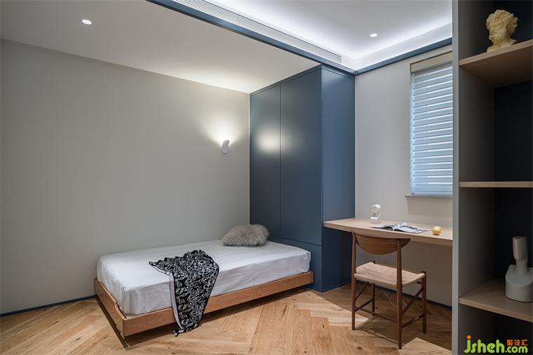 女兒房局部使用了女兒喜歡的霧霾藍色點綴,增添一抹活潑感,同時也豐富了整體空間的層次。