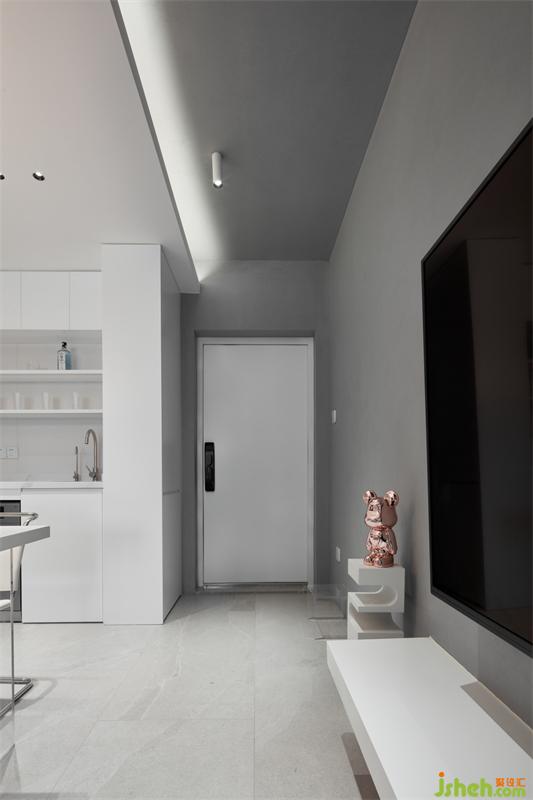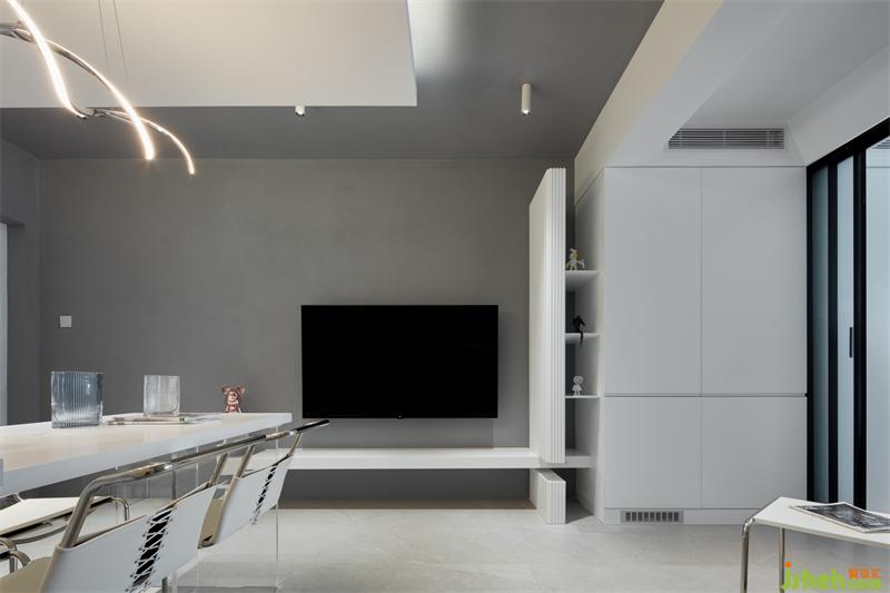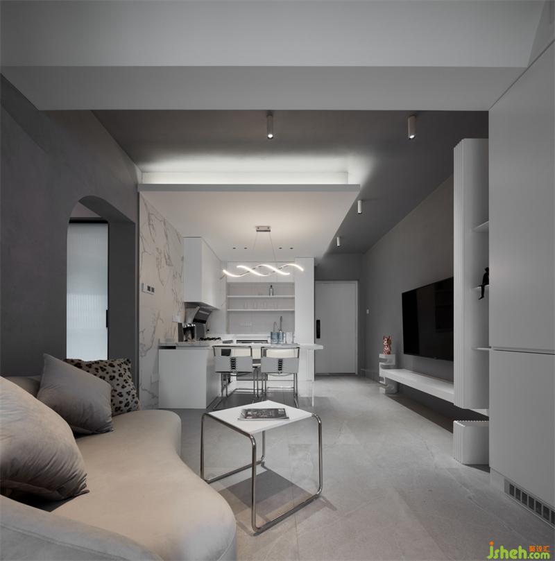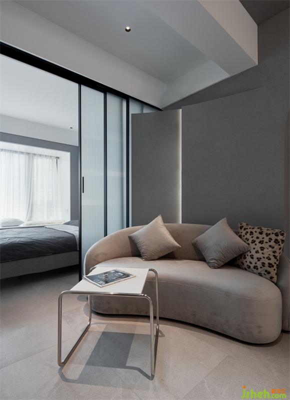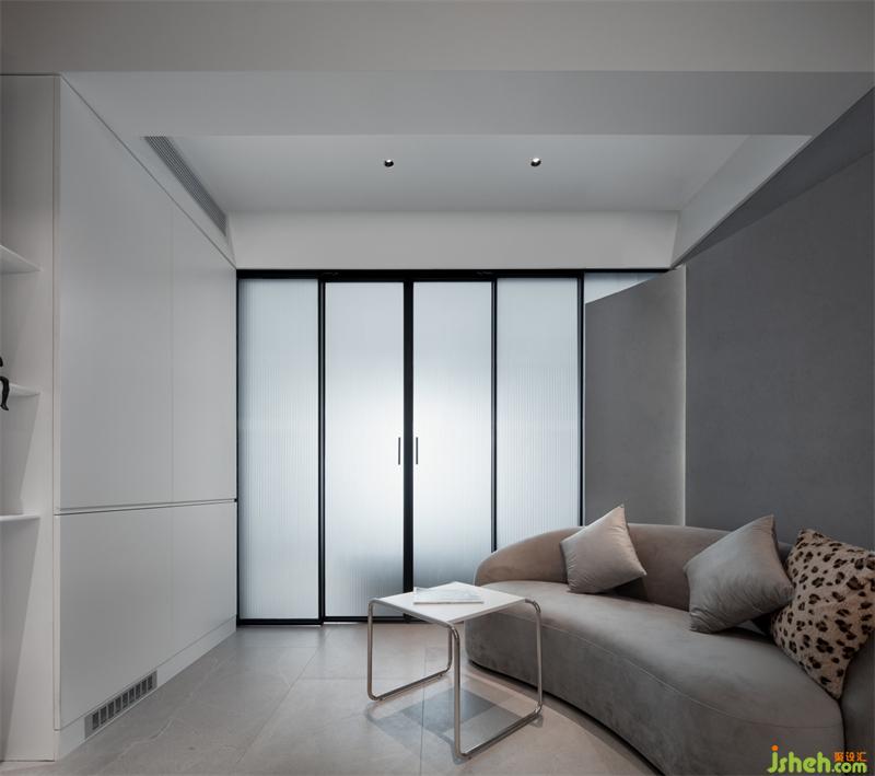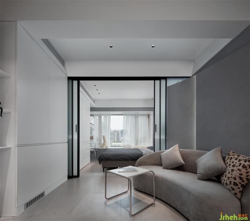 以隱藏式推拉門作為客廳與主臥分界,以白色和灰色為基調(diào),增加空間層次感,視線可穿透至窗外的景色,感受四季更替。