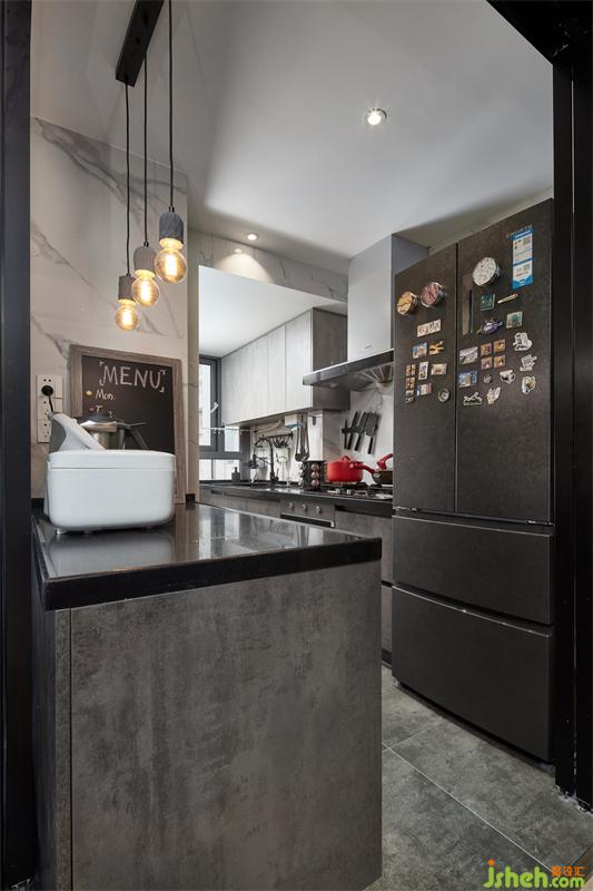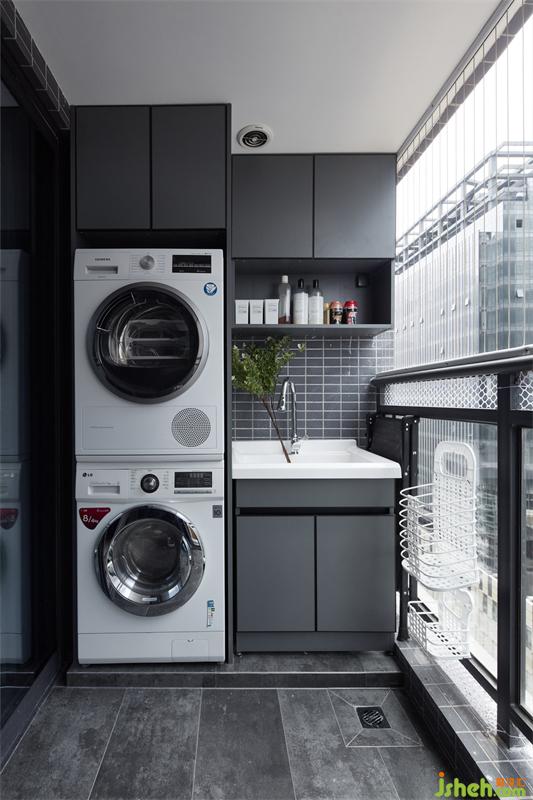 陽(yáng)臺(tái)一側(cè)定制整墻儲(chǔ)物柜,嵌入洗衣設(shè)備與洗手臺(tái),滿足屋主需求。洗衣臺(tái)底部抬高設(shè)計(jì),防止洗衣機(jī)和柜體受潮,高級(jí)的灰色調(diào)鋪滿墻面地面,搭配深灰色柜體,表現(xiàn)得耐看而有層次感。