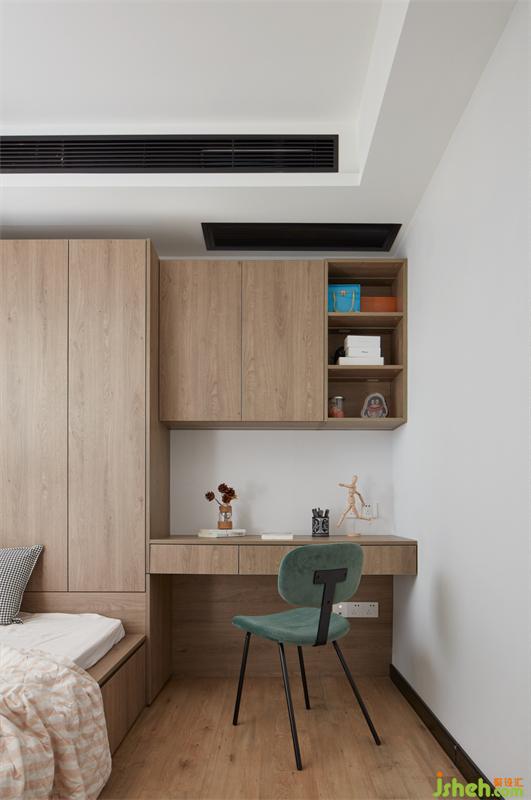 老人房將榻榻米床與衣柜書桌一體化設(shè)計(jì),充分利用每1㎡,收納空間翻倍。無(wú)把手的原木家具,沒有過多裝飾,整體給人以自然清新的氛圍感。