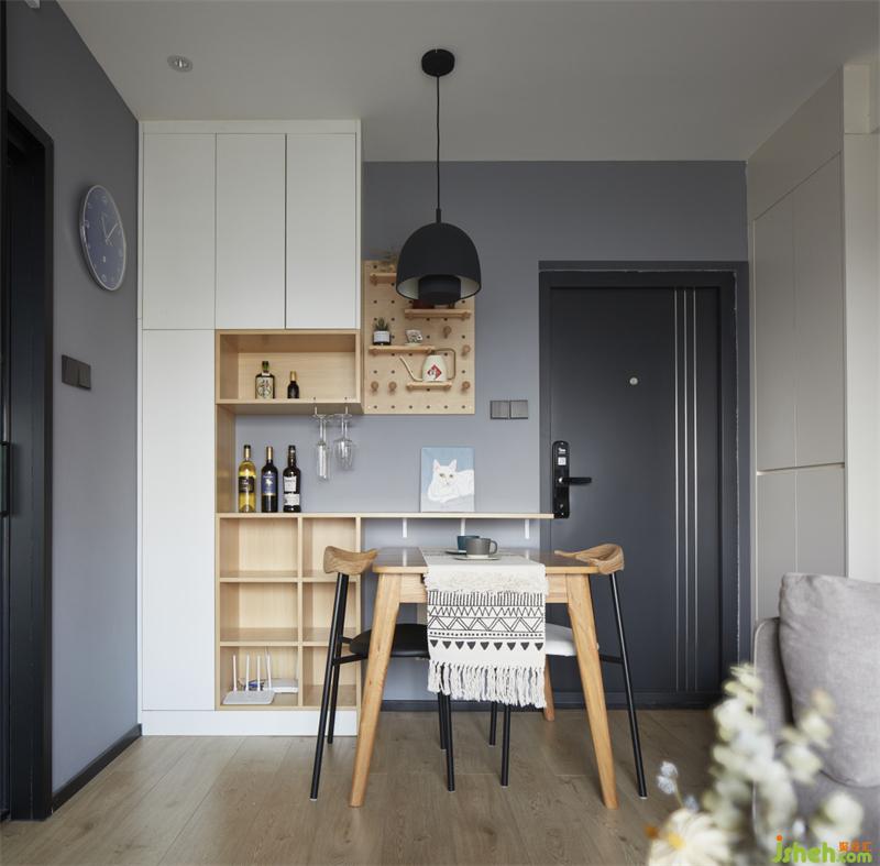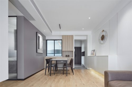 入戶左手邊鞋柜到頂這樣儲(chǔ)物量也夠,右手邊的餐邊柜白木結(jié)合,虛實(shí)對(duì)比,收納了整屋強(qiáng)弱電箱位與家用DYSON工具柜。哈哈更重要的是餐桌可以收納推進(jìn)去一個(gè)柜位,朋友到訪可以拉出來,平時(shí)兩口放進(jìn)去就餐也都很不錯(cuò)。