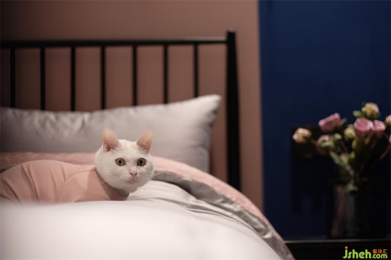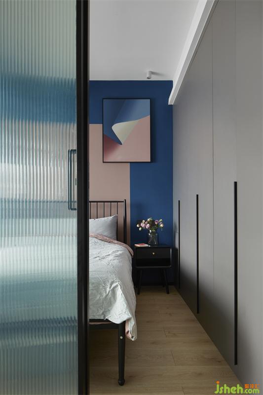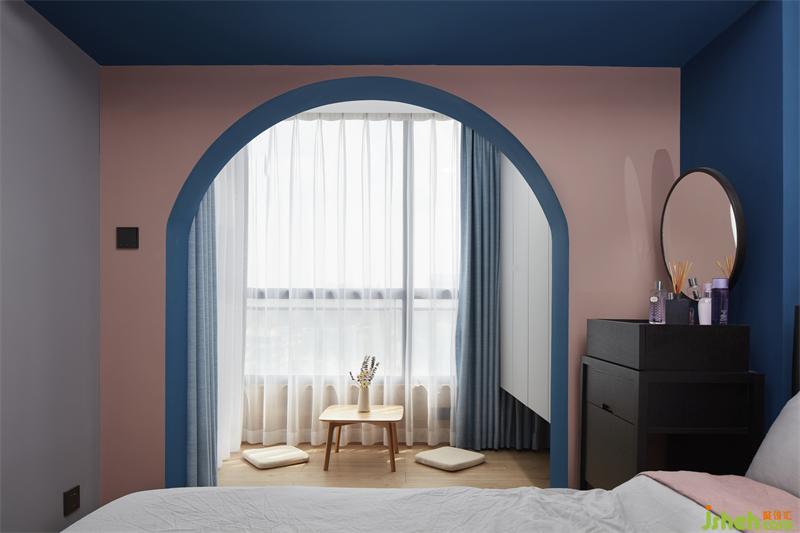 拱形元素用臟粉與藍色穿插,顯得這個衣帽間猶為儀式感,不落地的衣柜輕盈些許,去除繁雜,坐在窗邊享受這陽光灑落的感覺