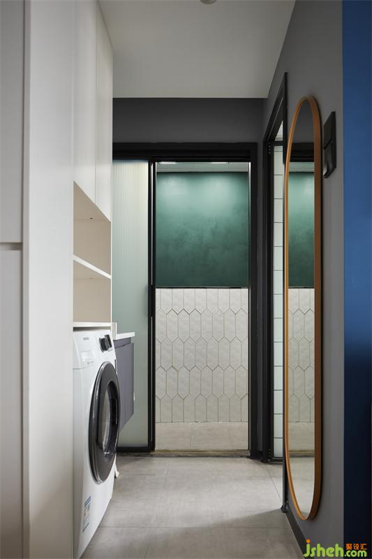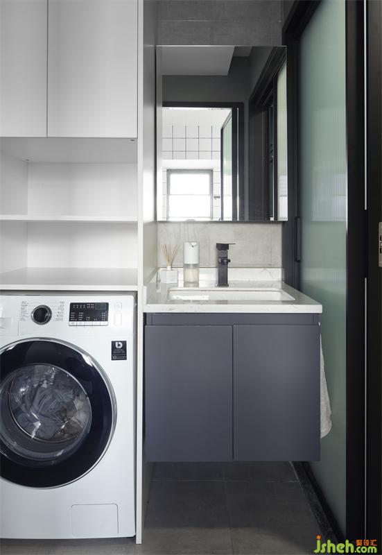 二次干濕分離洗手臺與家政洗衣區(qū)結合,完美解救陽臺區(qū)域給廚房,水泥灰的墻地磚與定制灰色洗手臺盆極簡與干凈