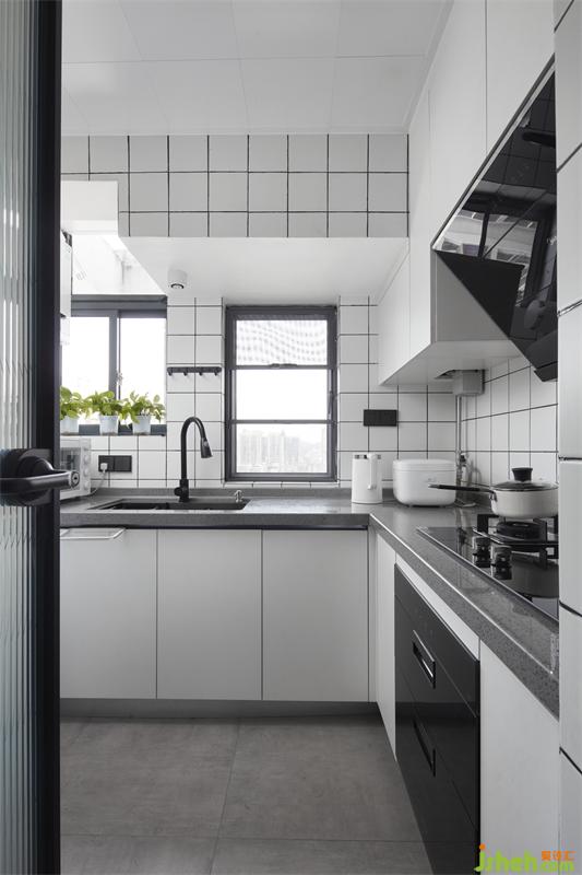廚房干凈清爽的小白磚與水泥地磚,勾以黑色美縫格外立體清新