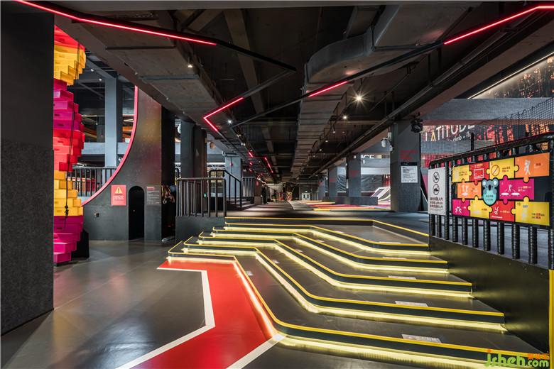 戶外的概念主題呈現(xiàn)在全民運(yùn)動(dòng)的休閑娛樂(lè)場(chǎng)所,室內(nèi)設(shè)計(jì)師將傳統(tǒng)印象中粗獷野性的極限運(yùn)動(dòng),轉(zhuǎn)變?yōu)榫屡c專業(yè)的運(yùn)動(dòng)體驗(yàn),山、水地形元素轉(zhuǎn)換成空間內(nèi)的硬件與情境。4F區(qū)域整合蹦床、滑索、攀巖各種戶外運(yùn)動(dòng),打造適合全民運(yùn)動(dòng)的品牌形象,透過(guò)品牌色彩結(jié)合燈光與視覺(jué)符號(hào),以更簡(jiǎn)單的線條、跑道與山陵形狀塑造室內(nèi)的動(dòng)態(tài)感,同時(shí)也兼具社交的功能。