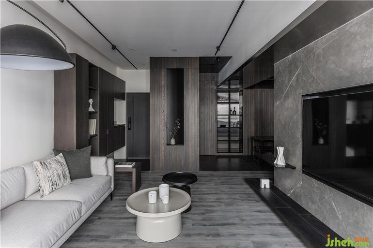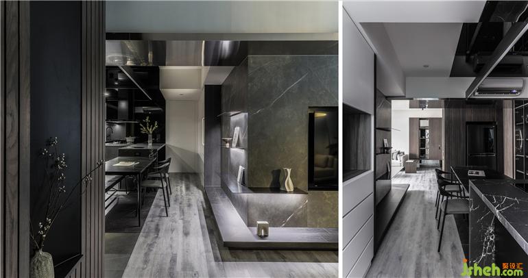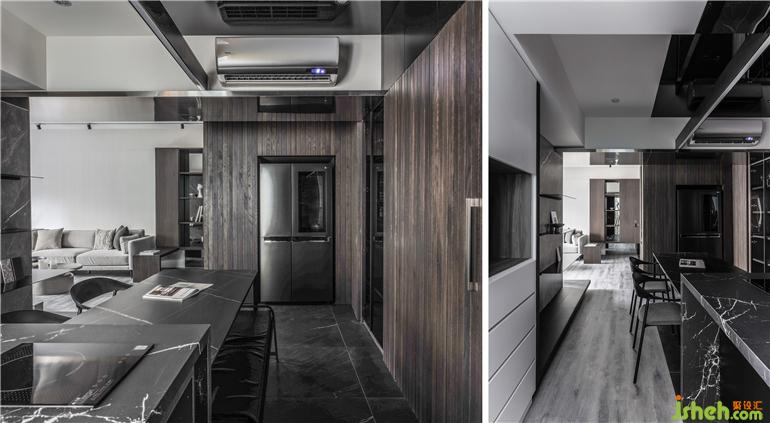 材質(zhì): 意大利大版磁磚,橡木實木皮染灰,耐磨海島型地板,毛絲面不銹鋼、灰鏡、火山巖、黑砂黑鐵件