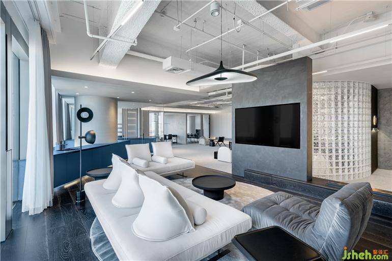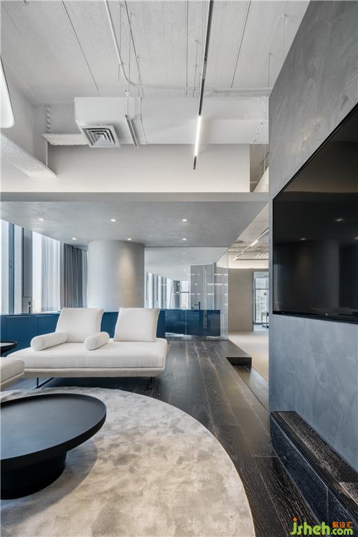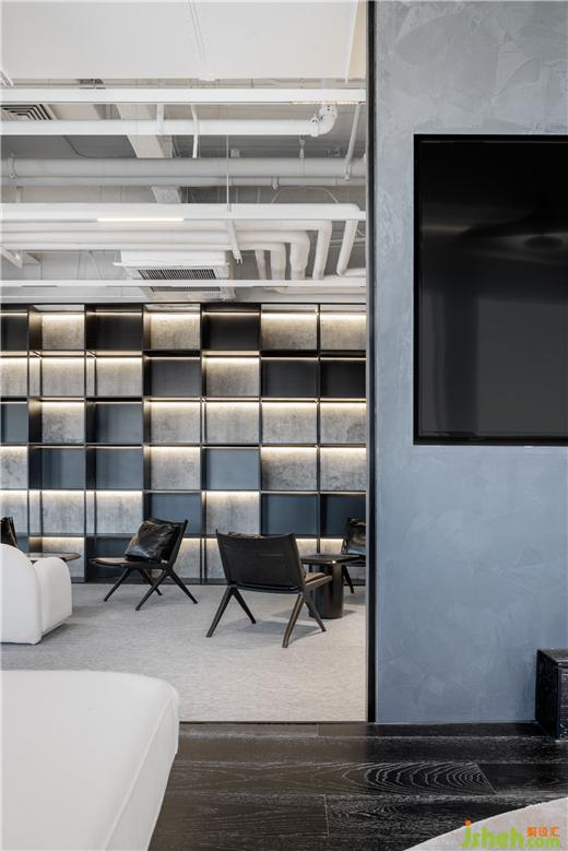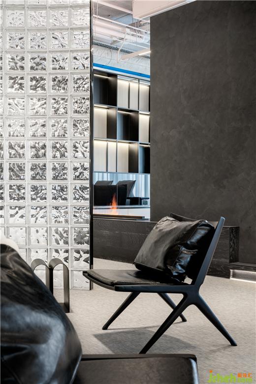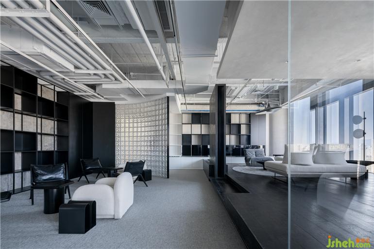 剛進入空間,視線從玻璃磚弧墻的側(cè)邊穿越而過,辦公室設(shè)計隱約可見寬敞的辦公室布局,左側(cè)為會客室與品酒區(qū),右側(cè)為書法茶室、主管辦公室、開放辦公區(qū)。會客室與品酒室以圓柱做為二區(qū)的分界,并規(guī)劃水吧區(qū)做為二區(qū)的緩轉(zhuǎn)處所,弱化圓柱突兀的沉重量體。我們以不對稱的天地結(jié)構(gòu)迭架出二區(qū)的空間框架,會客室的地坪架高,突顯該區(qū)的場域感,透過局部裸露的管線,營造出天花增高的視覺效果,空間的后半部則將天花局部封頂,延伸至整間品酒室,光滑平整的水平面,即是延伸,也是擴展。會客室與品酒區(qū)一高一低的結(jié)構(gòu)層次,以及水吧區(qū)的中繼轉(zhuǎn)換,共同賦予了空間比例上的安定與協(xié)調(diào),戶外遠(yuǎn)處景觀盡收眼底,結(jié)合工作與休閑感受。