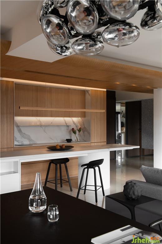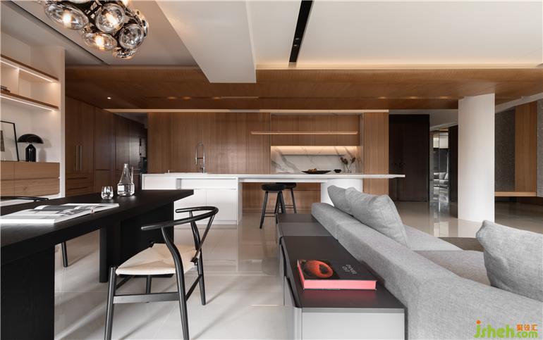材質:水磨石、意大利薄版磚、噴砂橡木實木皮、明鏡、灰鏡、毛絲面不銹鋼、黑鐵噴砂黑烤漆、霧面噴漆、倒角海島型實木地板、寬版黑色鋁百葉