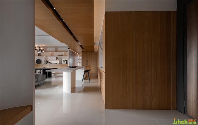 餐廳以原木質(zhì)基調(diào)為主,噴砂橡木天花迭加厚度形成高低差,裝修設(shè)計(jì)切劃出客餐廳的范圍,圓弧導(dǎo)角的設(shè)計(jì)柔化了邊界,削弱利落的線條帶來的冷冽感??紤]家人間的作習(xí)與用餐習(xí)慣不同調(diào),以及女主人烘焙習(xí)慣所需的大型工作空間,我們除傳統(tǒng)餐桌外,打造長四米六由意大利大型薄板磚的中島吧臺(tái),白底灰色大花亂紋的一抹質(zhì)感與原木色的柜體相互呼應(yīng),空間調(diào)性舒適放松,讓用餐多了點(diǎn)隨性與悠閑,早晨搭配簡(jiǎn)單的輕食,夜晚來點(diǎn)沉浸式的微醺調(diào)酒,順暢的回字動(dòng)線,讓喜歡宴客的屋主與親友互動(dòng)零距離。收納空間依照食品干貨、烘焙器具、咖啡調(diào)酒愛好等分類隱藏在木質(zhì)背墻里,挑選與天花同色系的紋理,讓純白的中島區(qū)在視覺上更顯集中聚焦。
