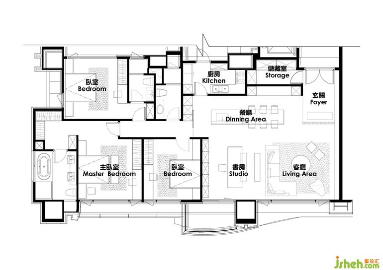 書房與客廳的場(chǎng)域邊界,由既有的橫梁切出一道分水嶺。書房做為客廳以外的另一個(gè)起居場(chǎng)所,黑色百葉的另一端,書柜堆砌出一片閱讀風(fēng)景,裝修設(shè)計(jì)垂直水平的網(wǎng)格線與秩序,是思緒行走的路徑,屋主常待在這翻閱雜志,處理一些工作上的事務(wù),陪伴著一旁的家人寫功課、玩游戲。此區(qū)域還兼有正式餐桌的共容性,240公分的橡木實(shí)木桌面可以容納8-10人同時(shí)用餐,平時(shí)家庭成員閱讀書房使用,假日則可轉(zhuǎn)變?yōu)榧易迮笥丫蹠?huì)正式用餐等靈活運(yùn)用特性。