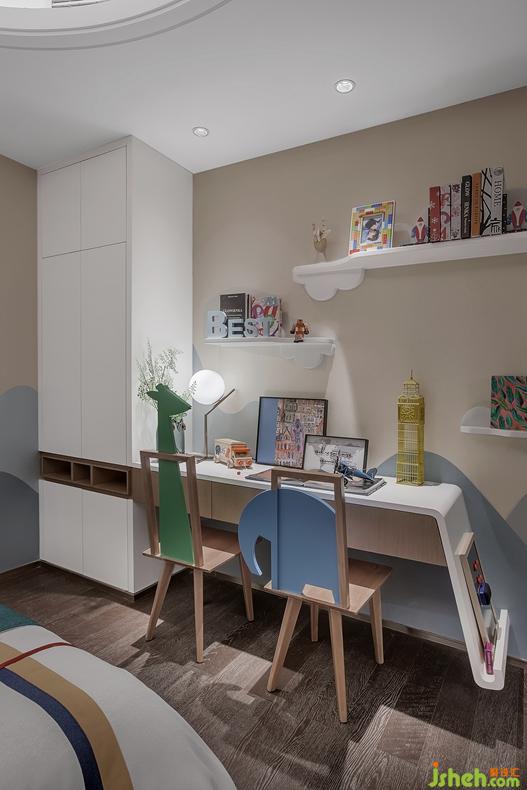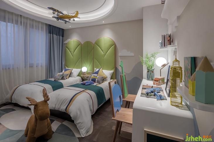 兒童房則以清新的綠色森林系主題從整個空間氛圍中跳脫出來,隨處可見的動物元素和山峰、云朵、飛機造型,為孩子構建了一個童真童趣的空間。設計師精心設計了一體式的衣柜書桌,合理規(guī)劃了生活和學習的區(qū)域。