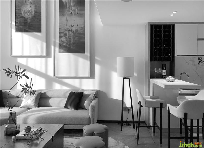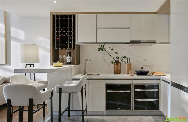 進(jìn)門走道右側(cè)為開放式廚房,白色啞光肌理巖板的運(yùn)用使廚房空間顯現(xiàn)出簡(jiǎn)潔、干凈的氣質(zhì)。餐吧臺(tái)同樣采用白色巖板作面,隱約見淡墨紋理浮于此中,似云煙,如遠(yuǎn)岫,平添了幾分詩(shī)意。鋼和木交織而成的黑色酒架,給質(zhì)感輕盈的白色空間增添了一絲沉穩(wěn)的優(yōu)雅。