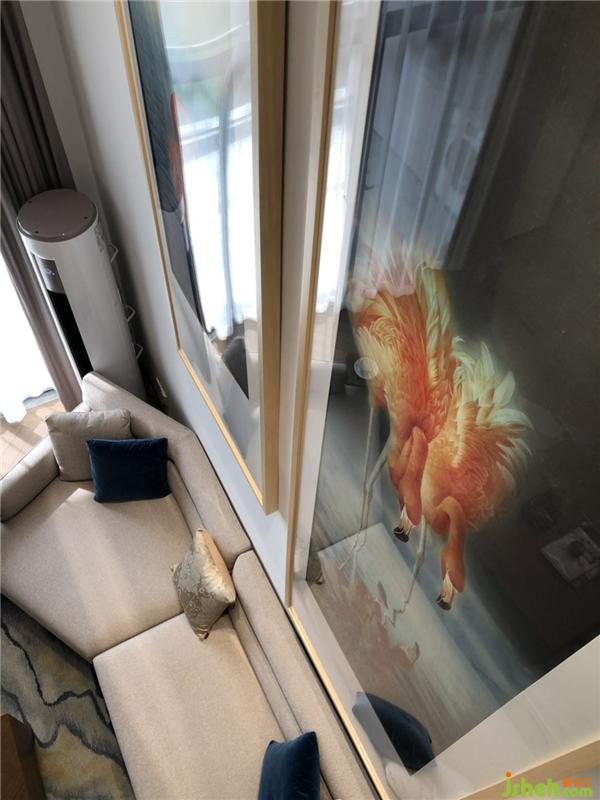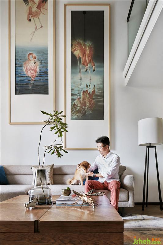 客廳設(shè)計(jì)延續(xù)簡(jiǎn)練、純凈的風(fēng)格,墻面以藝術(shù)家趙芳巨幅火烈鳥原作《云中歌》裝點(diǎn),折射出主人熱情自由的生活態(tài)度和高雅的藝術(shù)情趣。