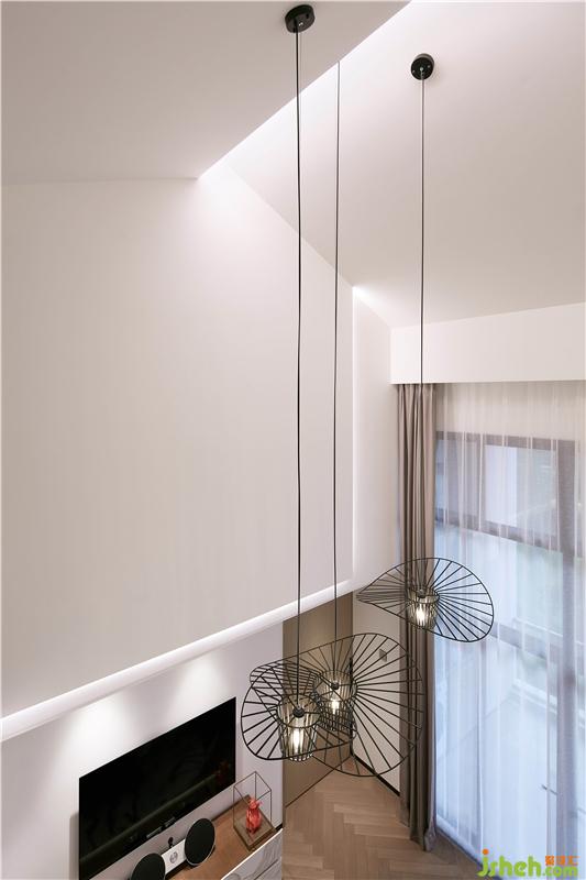 高挑空設(shè)計(jì)的客廳,以充足的垂直空間感,營(yíng)造出先抑后揚(yáng)的空間氛圍。高空輕盈垂落的藝術(shù)吊燈又強(qiáng)調(diào)了中庭挑高的縱向視覺效果,天花與墻面凹凸的純白造型達(dá)到了燈光與形體自然融合。室內(nèi)設(shè)計(jì)師