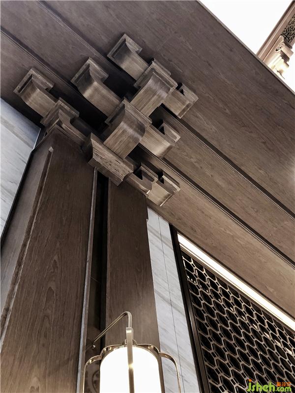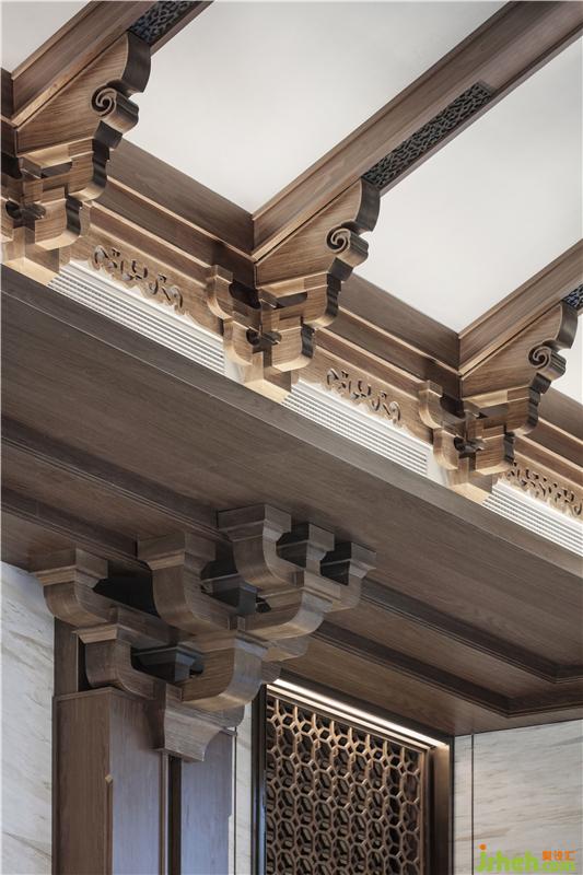 “山”為風(fēng)骨,“云”為志向。接待臺區(qū)背襯巨幅漆畫木雕花,將山、云元素精鏤細刻,融為一體。駐足觀瞻之際,仿佛身已在深山中,山中有云,云中有山,空間的禪意被自然地渲染而出。兩側(cè)對稱置暖色燈帶,帶來一絲安靜與溫潤氣質(zhì)。接待臺輔以水晶玻璃磚飾之,與古銅色不銹鋼形意合一,都市文化與傳統(tǒng)氣息于此交融。裝修設(shè)計