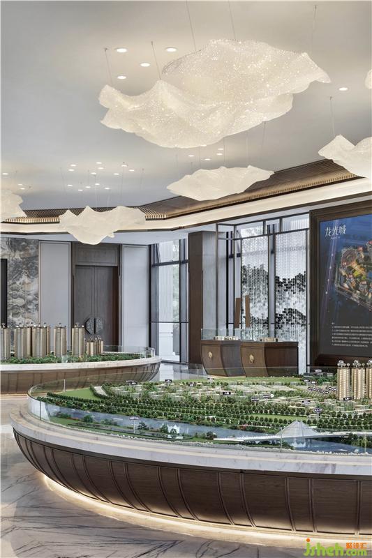 模型圖后另設(shè)山水紋水晶玻璃屏風(fēng),繁縟而有節(jié),化為映像的細聲,既是美的展示,又適宜空間的分割,影影綽綽之間感受“清風(fēng)徐來,水波不興”之境。裝修設(shè)計