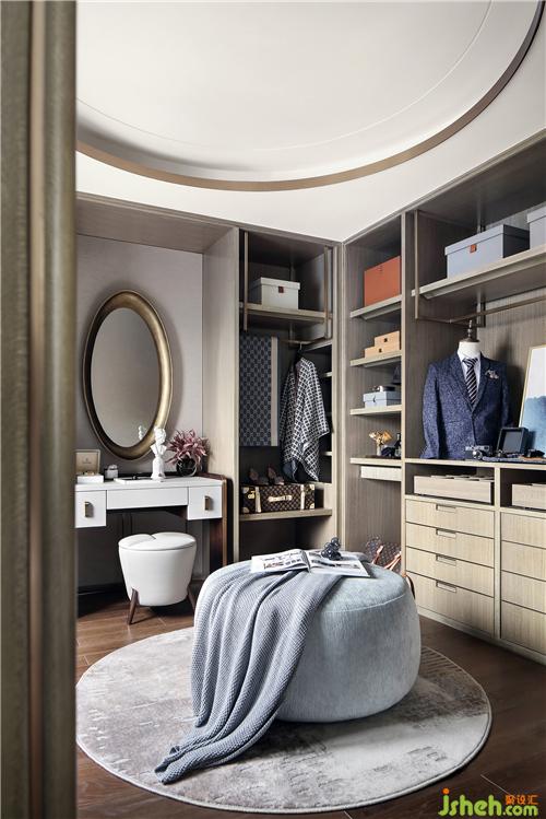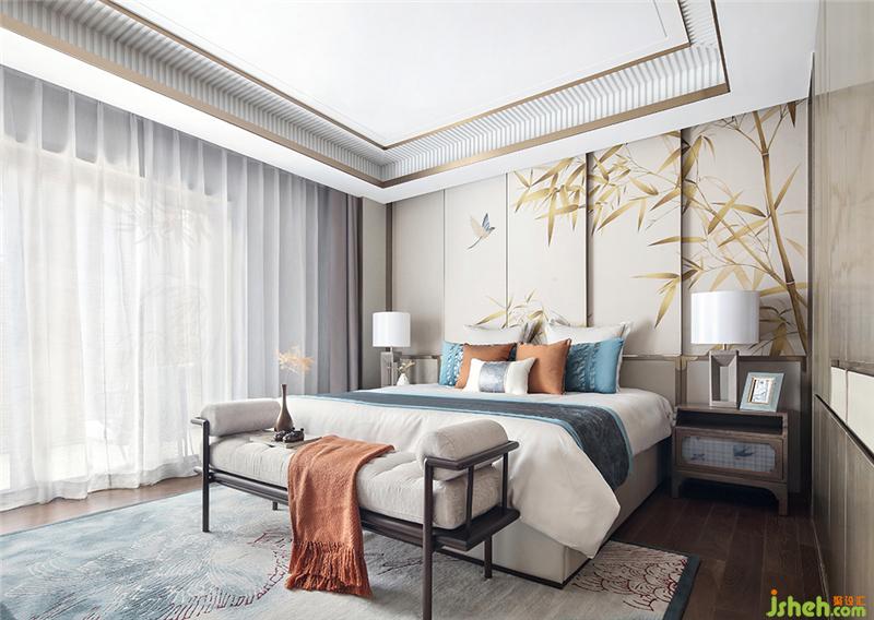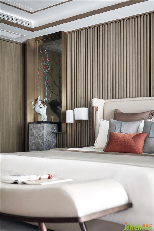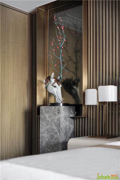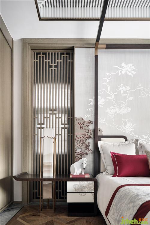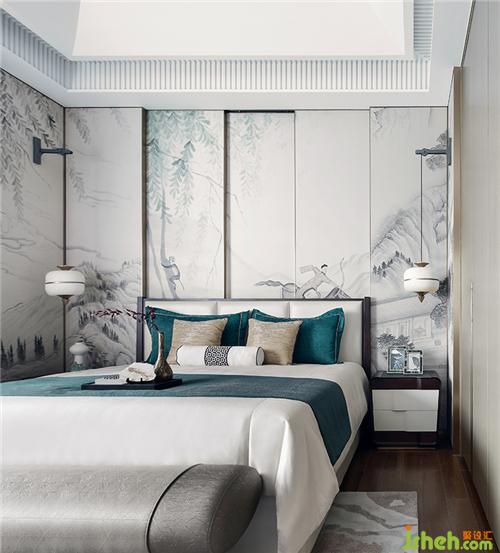 三層次臥以冷色調(diào)為主,軟包的床頭背靠著“傍花隨柳圖”,設計師根據(jù)主題設定圖案,色彩與空間融為一體。