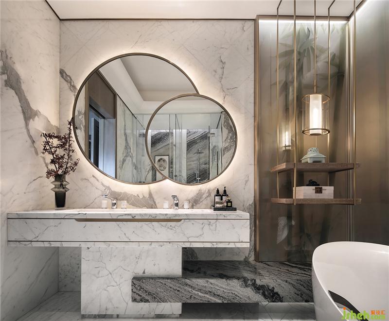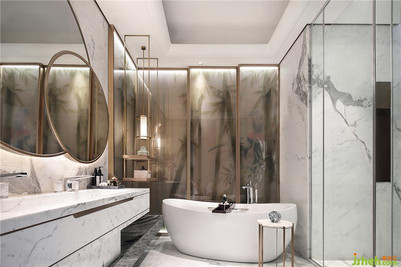 “莫聽穿林打葉聲”主衛(wèi)藝術(shù)玻璃屏風上的竹韻鳥鳴,黑白灰與墨綠色的交織,典雅別致,光影搖曳,仿佛置身于兼工帶寫的水墨情境中。