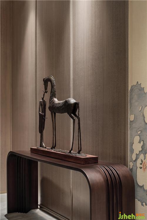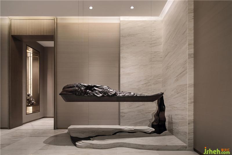 負(fù)二層過道的設(shè)計(jì)以“魚翔淺底”為主題,通過藝術(shù)家張華的作品——《云中歌》,結(jié)合大理石墻面及地臺的流水造型,搭配暖色的燈光,自在又安穩(wěn)。表達(dá)出自在悠揚(yáng)的永恒畫面。人與空間對話,人與物的對話在瞬間定格在剎那。