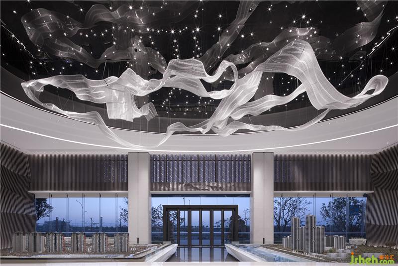 挑空大堂將宇宙的斗轉(zhuǎn)星移幻化于空間之中,有如夜空之中璀璨的星光,飄逸舞動的藝術(shù)燈飾裝置蜿蜒流轉(zhuǎn),如同九天銀河匯入星海,伴隨人影流動,頗有踏月神行、遨游星海的輕盈感。空間中摒除多余裝飾,光影在有限的空間尺度投射出無限的闊度,于方寸之間,獲得震撼心靈的觀感體驗。