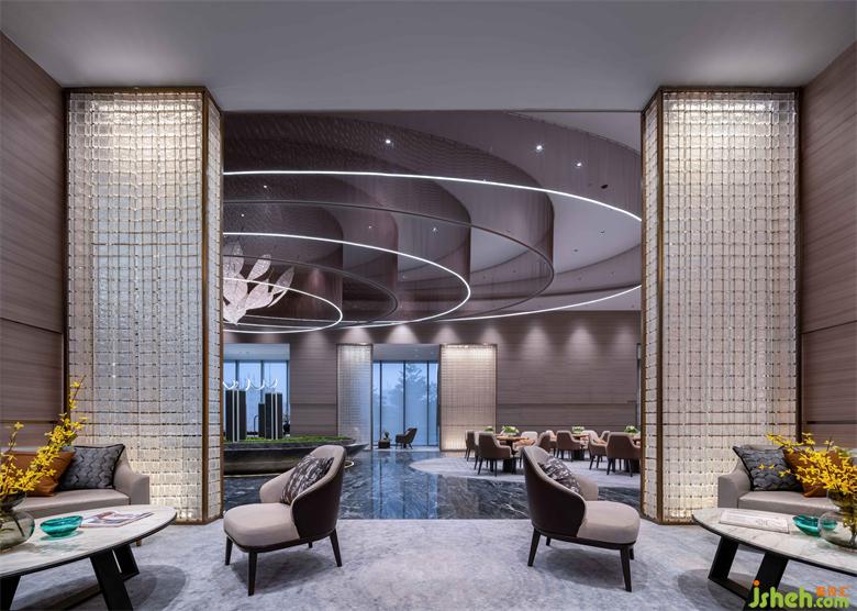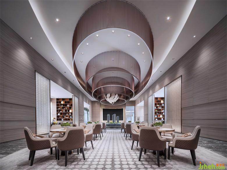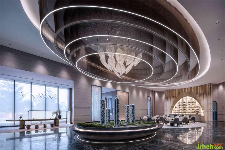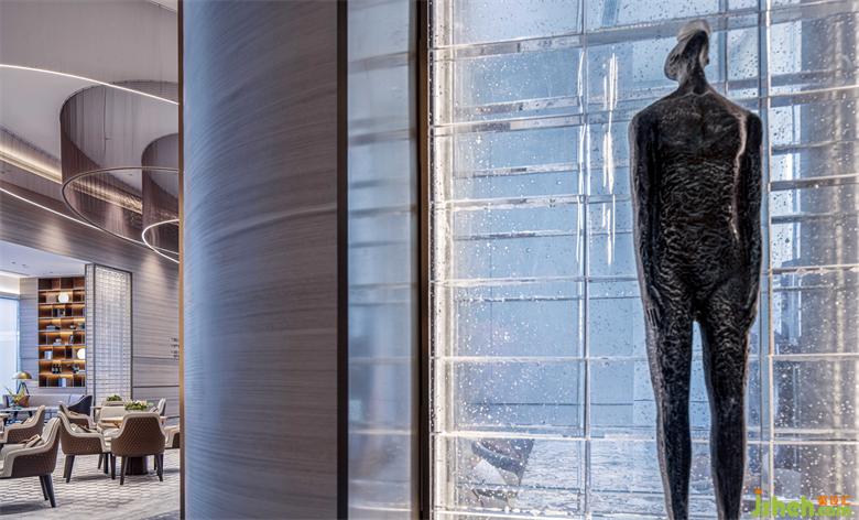 流動是水的永恒,深圳營銷中心設計提取流水漣漪意象予以藝術(shù)化重構(gòu),將金屬簾以陣列感層層散開,其蜿蜒的形姿于節(jié)奏感中散溢出清透高雅的美感,亦如大地之眼,使空間變得富于張力,也成為空間的靈魂及視覺焦點。